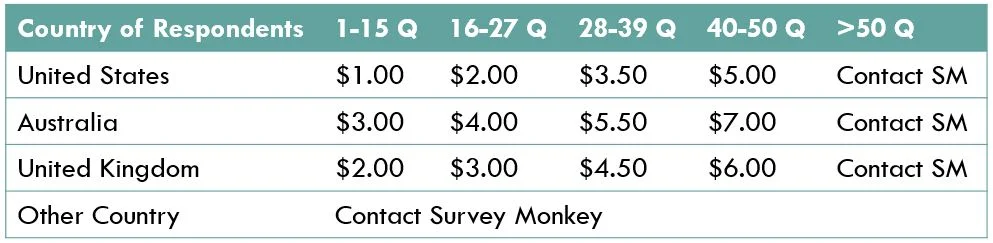 Here's some information from SurveyMonkey on how to set up a target market demographic survey: When creating a Targeted Audience Collector, the price per response is based on the country of your survey respondents, the number of questions in your survey, and your targeting criteria. Use the following table to see the price per response based on the country of your survey respondents and the number of questions in your survey. Each targeting option you select costs an additional $0.50 – $10.00 per response, depending on how common or difficult it is to find among our available respondents.